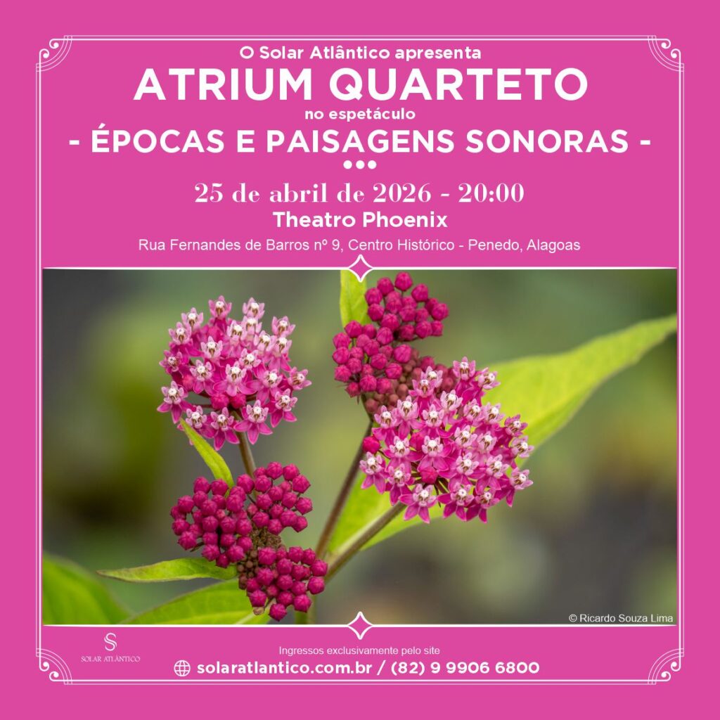 Em Abril iniciaremos a temporada musical 2026, no quinto ano de abertura do Theatro Phoenix ao público. Apresentaremos o Atrium Quarteto, composto pelos músicos Débora Borges (1° violino), Bruno Tenório (2° violino), Olívio Fernandes (viola), e Almir Medeiros (violoncelo).